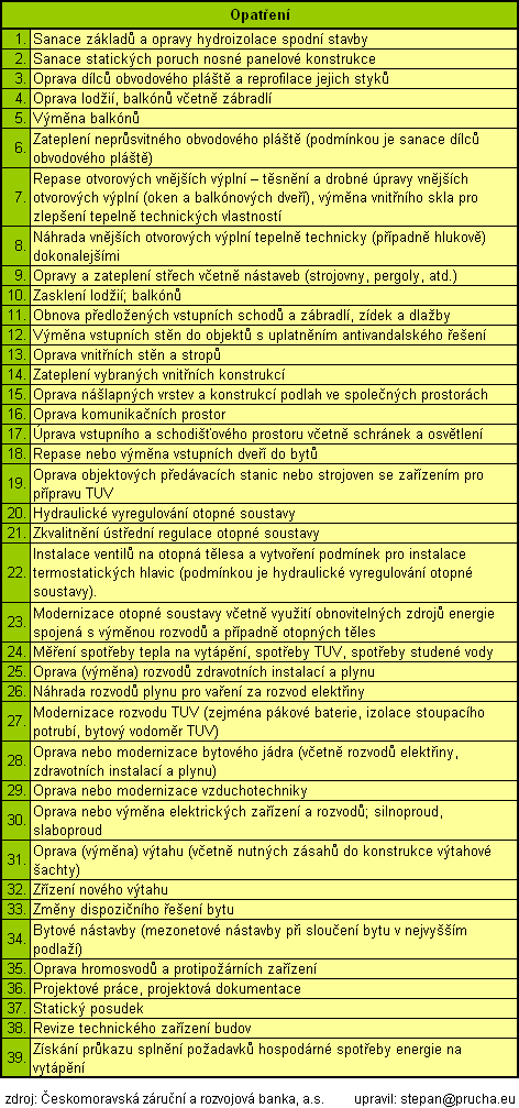 Bytová družstva (BD) i Sdružení vlastníků jednotek (SVJ) mají možnost získat výhodné úvěry na rekonstrukce bytových domů. Rekonstrukce panelových i cihelných domů jsou podporovány státem přes Českomoravskou záruční a rozvojovou banku, a.s. (ČMZRB) a Státní fond rozvoje bydlení (SFRB) - tyto instituce poskytují BD i SVJ záruky za úvěry resp. dotace k úrokovým sazbám - díky tomu se například investice do zateplení pláště domu finančně vrátí již po několika letech. Kompletní seznam podporovaných oprav a modernizací můžete nalézt v tabulce níže.